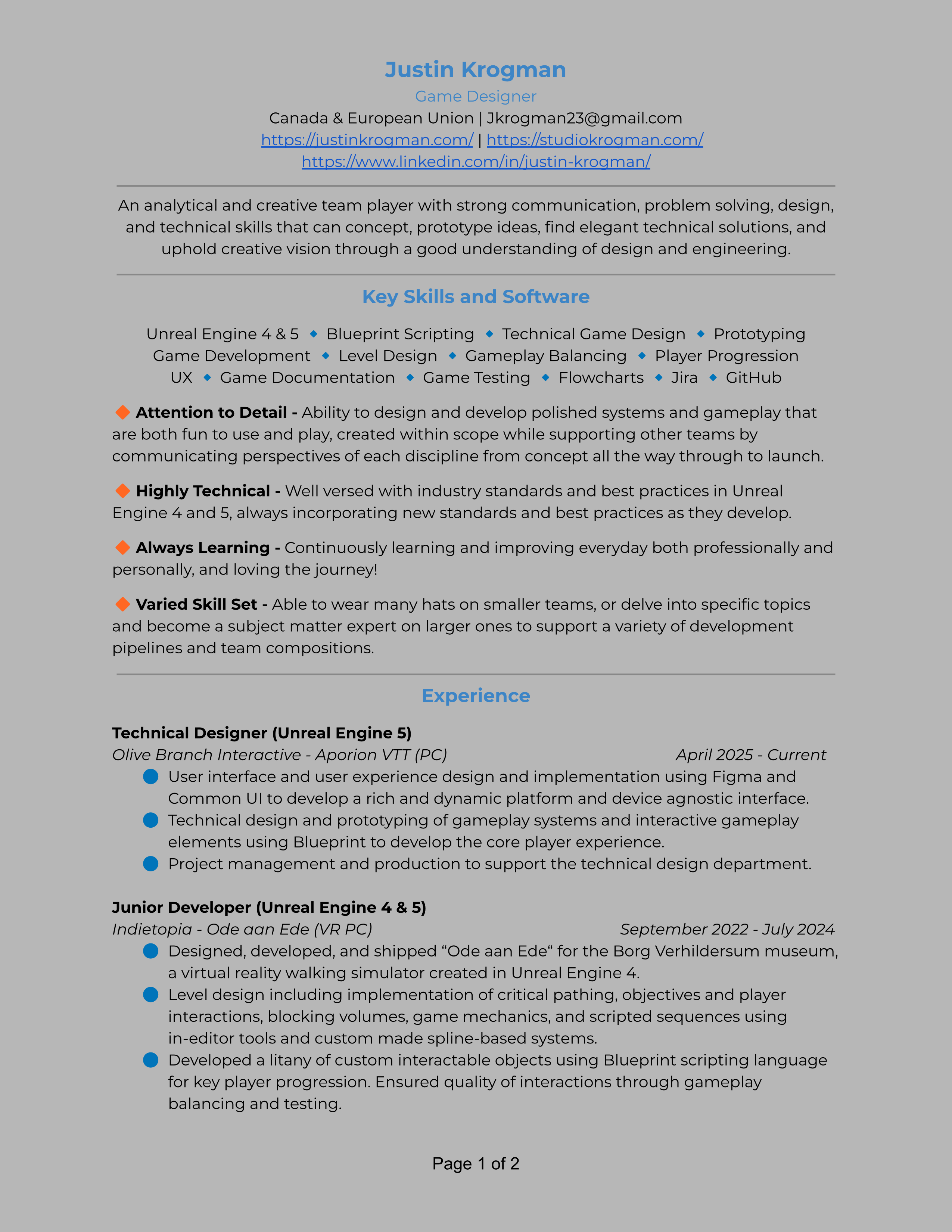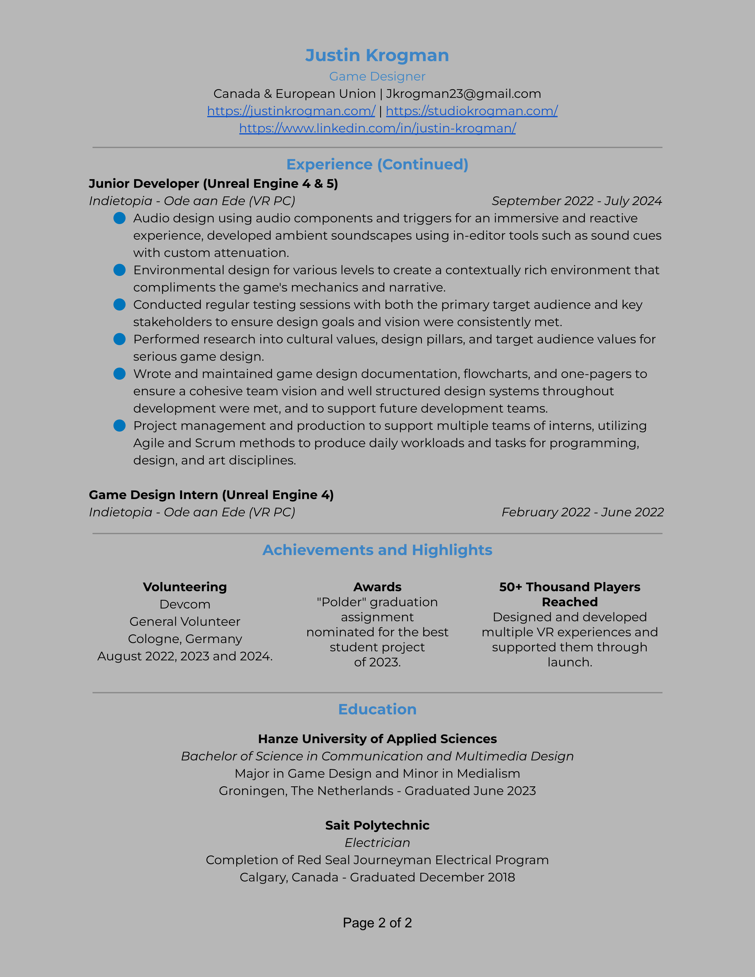 On these pages you can find additional content such as my life story, a breakdown of my Game Design, Game Development, and Electrical skills, information and pricing about the contract and freelance work I offer, and how you can contact me through social media and private correspondence.